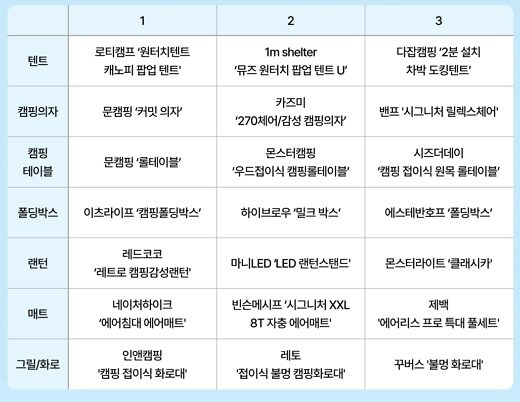 편안한 잠자리와 냉기 차단을 위한 필수품인 매트는 네이처하이크의 ‘에어침대 에어매트’, 따뜻한 기운과 함께 맛있는 식사를 책임져 줄 그릴·화로는 인앤캠핑의 ‘캠핑 접이식 화로대’가 인기를 끌었다.