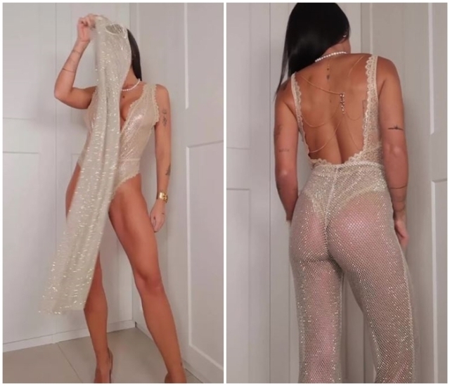 바디 슈트 형태의 시스루 복장을 입는 모습을 보여준 자드는 먼저 반짝이는 시스루 상의와 하의를 입은 후 위에 카디건을 레이어드로 걸쳐입첬다.