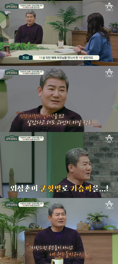 진성은 지난 2022년 채널A '오은영의 금쪽 상담소'를 통해 "내가 3살 되던 해에 부모님들이 집을 나가 친척 집들을 전전하면서 살았다"며 "그러다 내가 11살 되던 해에 부모님을 만나 한 1년 살았는데 매일 또 부모님이 싸웠어. 그러니까 사실 지겨웠다. 내가 유년 시절에 보고 자란 것은 건전한 것 보다는 인간 시장의 밑바닥이었다고 해도 과언이 아닐 정도였다"고 고백했다.
