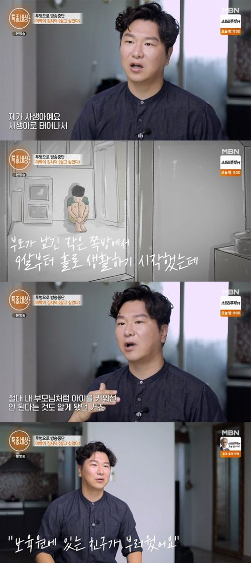 이어 "어렸을 때는 부끄러워서 어디서 얘기도 못 했다. 근데 지금은 나도 한 집안의 가장이고 나이도 어느덧 40대에 왔고 말해도 상관없겠다고 생각해서 떳떳하게 말하는 거다"라고 운을 뗀 김시덕은 "내가 사생아다. 사생아로 태어나서 아버지는 본인의 가정으로 돌아가셨고 어머니도 나를 키우시다가 본인의 행복을 찾아서 새로운 삶을 찾아 떠나셨고. 그렇게 9살 때부터 나는 혼자 살게 된 거야. 이게 말도 안 되는 상황인데 사실이거든"이라고 토로했다.