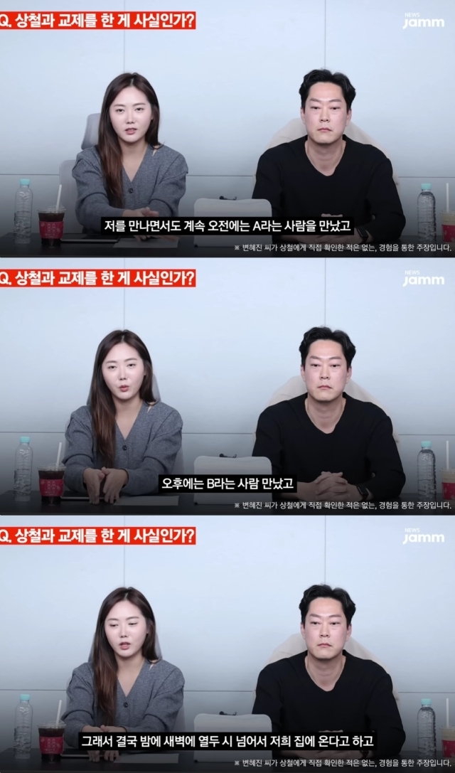 이 가운데 상철과 과거 교제했던 종합편성채널 MBN '돌싱글즈 3' 출연자 변혜진도 나섰다. 변혜진은 지난 15일 유튜브 채널 '뉴스잼'에 출연해 "(상철이) 나를 만나면서도 오전에는 A라는 사람을 만났고, 오후에는 B라는 사람을 만났고, 새벽에 열두 시 넘어서 저희 집에 온다고 하고. 이런 것들이 반복되다 보니 관계 정리를 했다"라고 폭로한 바 있다.