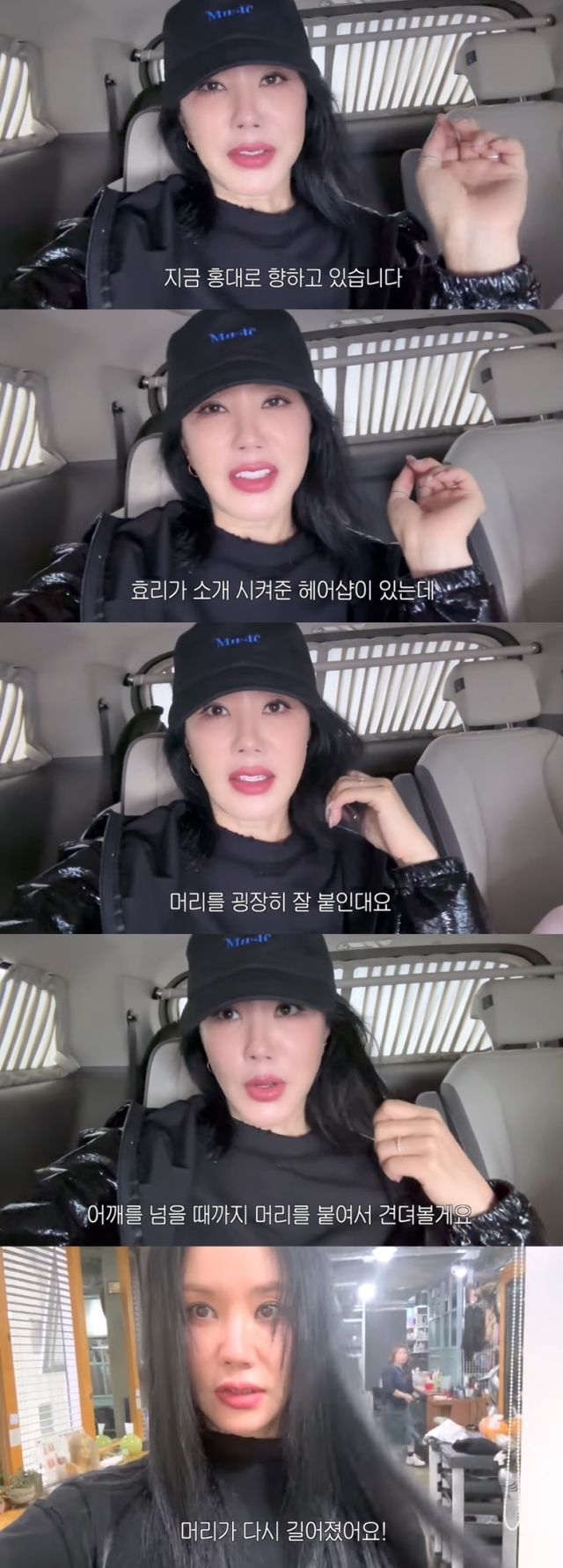 영상 속 엄정화는 "지금 홍대로 향하고 있다"며 "효리가 소개해준 헤어샵이 있는데, 머리를 굉장히 잘 붙인다더라. 그래서 지금 (머리가) 어깨 길이인데, 좀 재미 없고 계속 묶게만 되니까 어깨를 넘을 때까지 머리를 붙여서 견뎌보겠다"고 말했다.