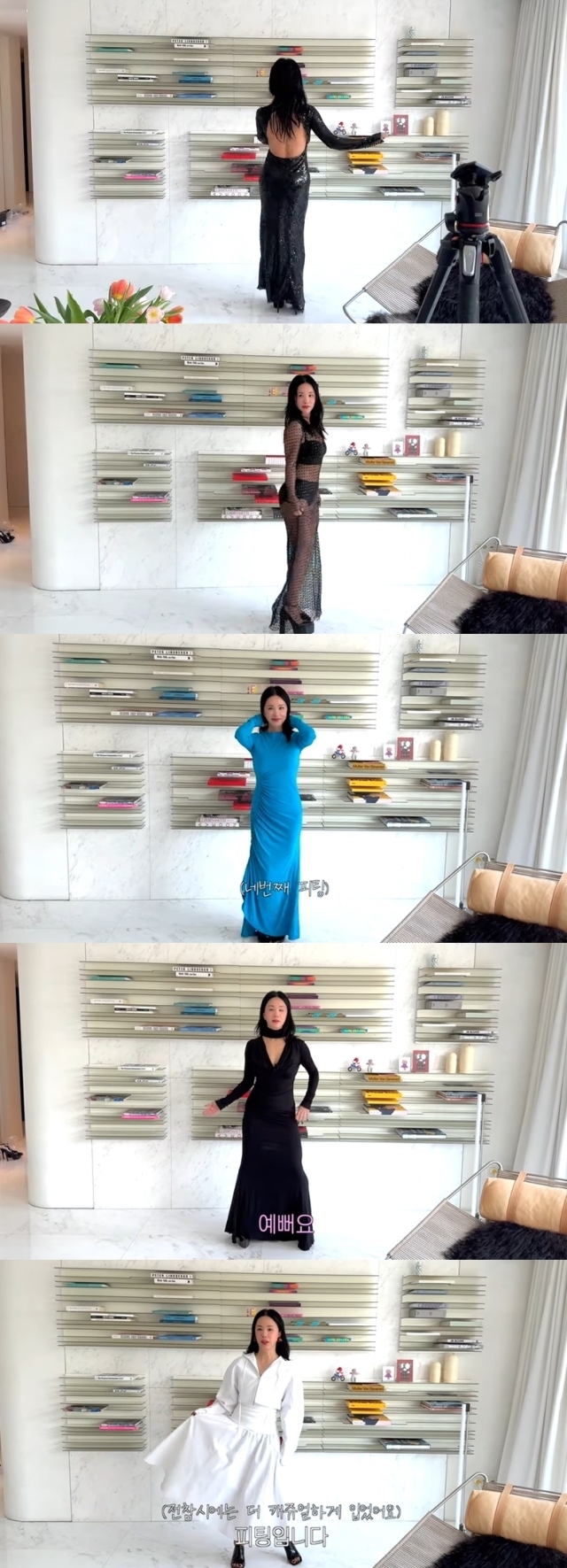 이어 비비드한 색의 드레스와 목이 깊게 파인 드레스, 캐주얼한 스타일링까지 피팅을 완성한 엄정화는 의상이 마음에 든 듯 포즈를 취하며 피팅을 마무리했다.