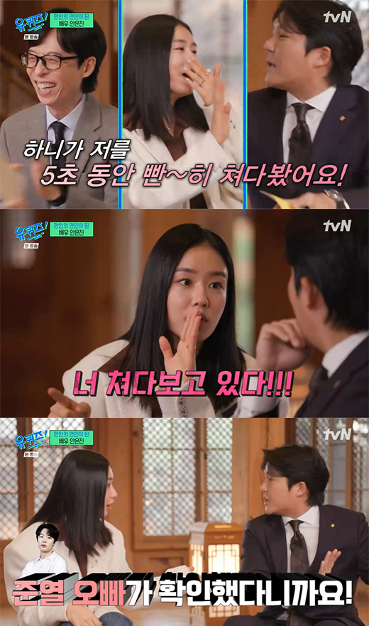 지난 7일 케이블채널 tvN '유 퀴즈 온 더 블럭'에 게스트로 출연한 안은진은 덕질이 삶의 활력이라며 "최근에 뉴진스를 봤다"고 자랑하더니 "청룡영화상에서 뉴진스를 봤는데 제 하니가 최애인데 하니가 5초 동안 저를 빤히 쳐다봤다"고 돌이켰다.