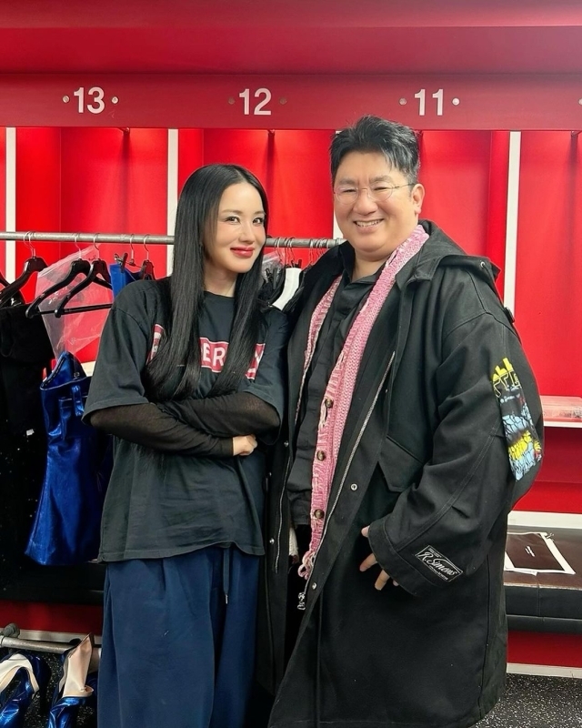공개된 사진에는 엄정화와 방시혁이 나란히 카메라를 응시하고 있다. 지난 9일과 10일 양일간 서울 잠실 학생체육관에서 열린 2023 엄정화 단독 콘서트 '초대'를 방시혁이 찾았던 것. 두 사람은 환한 미소로 숨기지 않고 반가움을 드러냈다.
