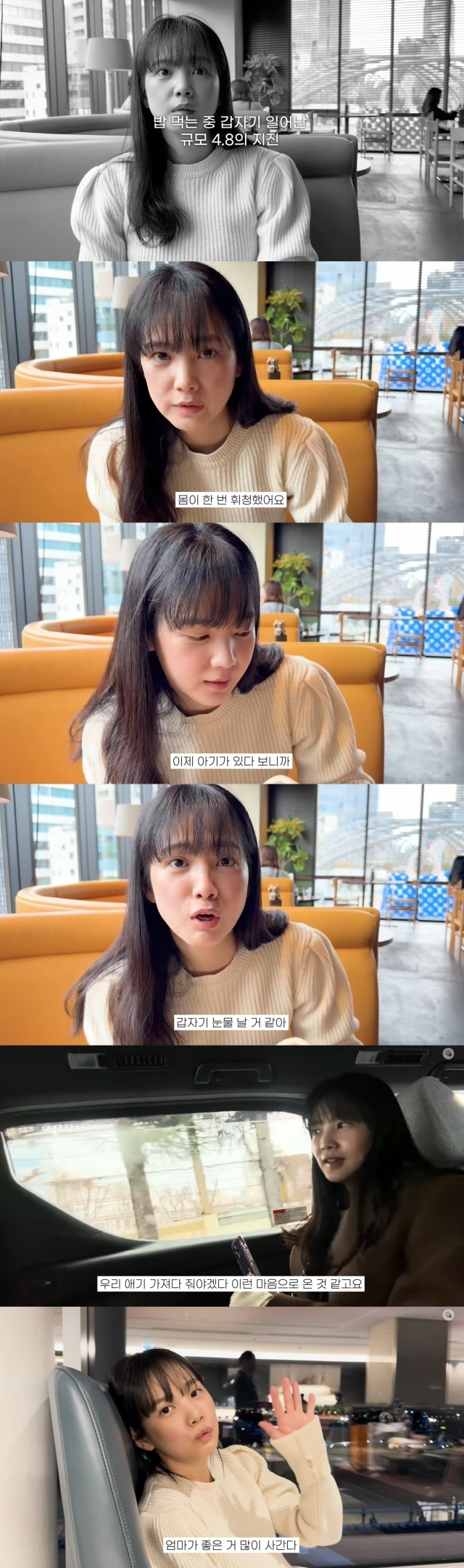윤승아는 "밥 먹는데 갑자기 몸이 한 번 휘청했다. 지진이 일어난 거 같은데 왜 문자가 안 오지? 직원 분들도 한 번 보시고 (일을 다시 하더라)"라며 "너무 순식간에 일어났는데 진짜 깜짝 놀랐다. 소름 돋았다. 이제 아기가 있다 보니까. 갑자기 눈물 날 거 같다"라고 놀란 엄마의 마음을 털어놨다.