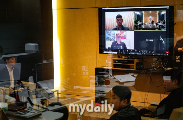축구대표팀 클린스만 감독이 화상으로 회의에 참석하고 있다.