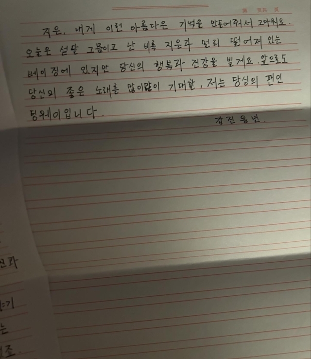 아이유가 공개한 사진에는 탕웨이가 3장에 걸쳐 한글로 한 자 한 자 꾹꾹 눌러담아 쓴 흔적이 담겼다.