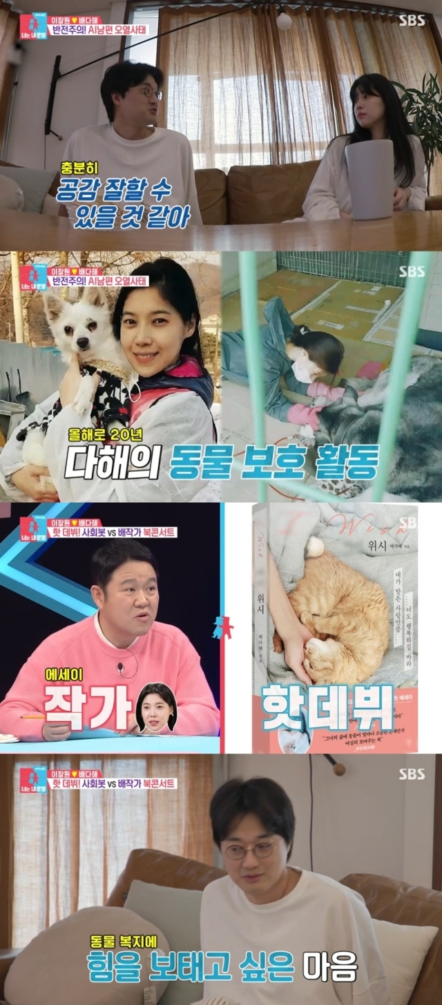 '동물농장'을 보고 있는 이장원에게 배다해는 "내 책도 상생하는 내용이다. 읽었냐"라고 묻자 이장원은 "동더삶 아니냐. 동물과 더불어 사는 삶. 어떻게 그렇게 책을 쓸 생각을 했냐"라며 놀라움을 표했다. 그러면서도 배다해가 가장 공감 갔던 부분을 묻자 "남편이 준팔이 영양식을 만들었다는 부분이 아무래도 눈길이 가더라. 아, 그 남편이 나냐"라고 너스레를 떨어 웃음을 자아냈다.