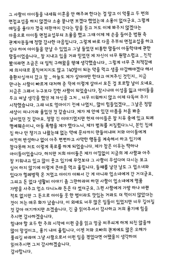 아름은 이어 "(전 남편이) 미안하다고 해서 바보같이 마음이 약해져 봐 주고 병원 가서 진단서 하나를 못 뗀 게, 지금 저를 폭행한 사건에 대해서는 고소가 먹히지 않는 큰 이유라 한이 맺혔다"고 호소했다.