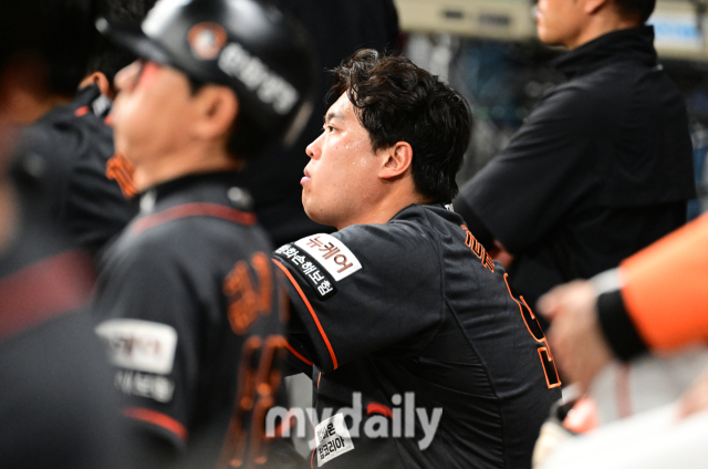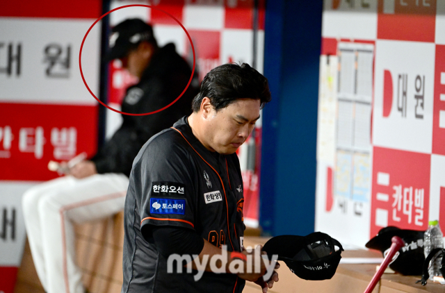 [류현진 야구 인생 최악투를 펼친 날, 최원호 감독이 고개를 숙인 채 반성하고 있다 / 고척 = 유진형 기자 zolong@mydaily.co.kr]