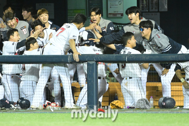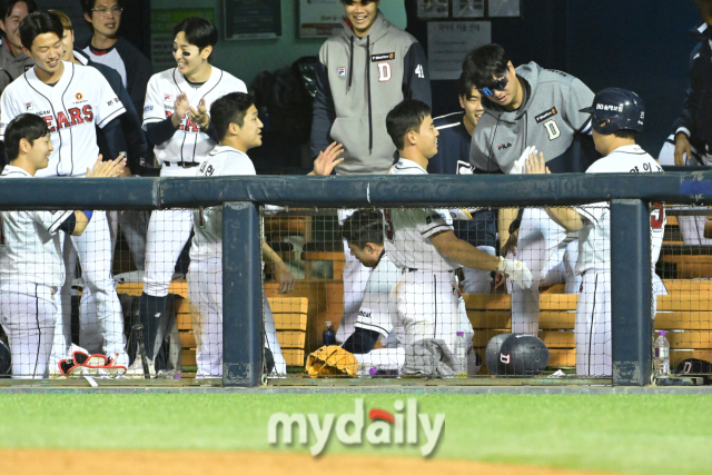 동료들이 얼마나 강하게 때렸는지 더그아웃에서 동료들의 축하를 받던 김재환은 털썩 주저 않았다. 잠시 후 정신을 차리고 다시 더그아웃 끝까지 동료들과 하이파이브를 하며 기쁨을 나눴다.