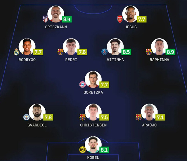 2023-24시즌 UEFA 챔피언스리그 8강 1차전 베스트11 공격수에는 제주스(아스날)와 그리즈만(아틀레티코 마드리드)가 선정됐다. 측면 공격수에는 호드리구(레알 마드리드)와 하피냐(바르셀로나)가 이름을 올렸고 미드필더진은 페드리(바르셀로나), 비티냐(PSG), 고레츠카(바이에른 뮌헨)가 구축했다. 수비진에는 그바르디올(맨체스터 시티), 크리스텐센(바르셀로나), 아라우호(바르셀로나)가 포진했고 골키퍼에는 코벨(도르트문트)이 선정됐다.