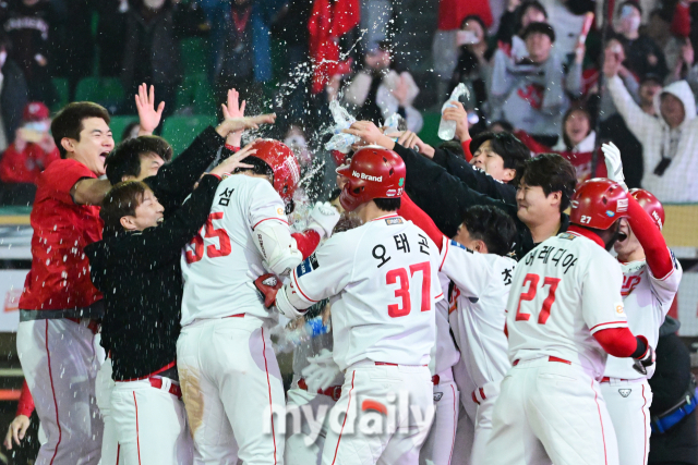 끝내기 홈런을 때린 한유섬을 홈플레이트에서 동료들의 물세례를 받으며 기뻐했다.