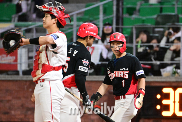 [마이데일리 = 인천 곽경훈 기자] 17일 인천SSG랜더스필드에서 진행된 '2024 신한 SOL 뱅크 KBO 리그' 기아-SSG의 경기. KIA 김도영이 9회초 무사 1루에서 SSG 이기순을 상대로 투런 홈런을 때리자 선행주자 박찬호가 놀라고 있다.