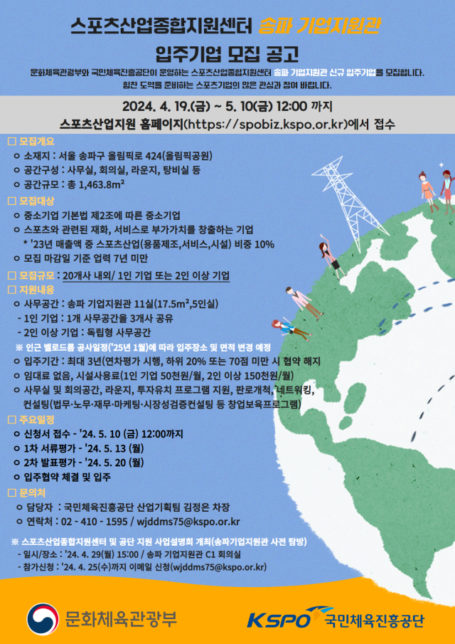 [마이데일리 = 노찬혁 기자] 국민체육진흥공단은 문화체육관광부와 함께 ‘2024년 스포츠산업종합지원센터 송파 기업지원관’에 신규로 입주할 기업을 모집한다고 밝혔다.