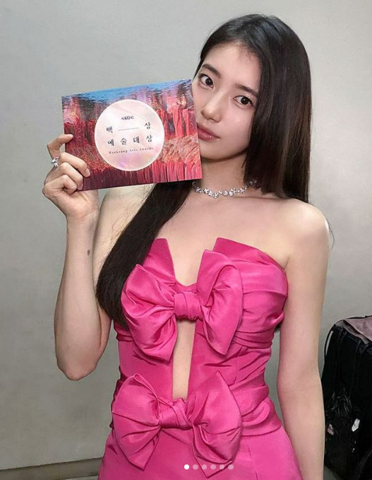 수지의 소속사 측은 7일 공식 채널을 통해 "#현장숲찍 #제60회백상예술대상 MC #수지 아름다운 #드레수지 모습에 올해도 심쿵.."이라는 글과 함께 여러 장의 사진을 게재했다.