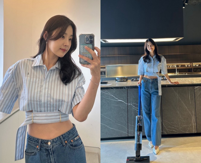사진 속 한지혜는 하늘색 크롭 셔츠를 입고 청량한 미모를 뽐냈다. 청바지와 플랫슈즈에도 완벽한 비율이 돋보인다.