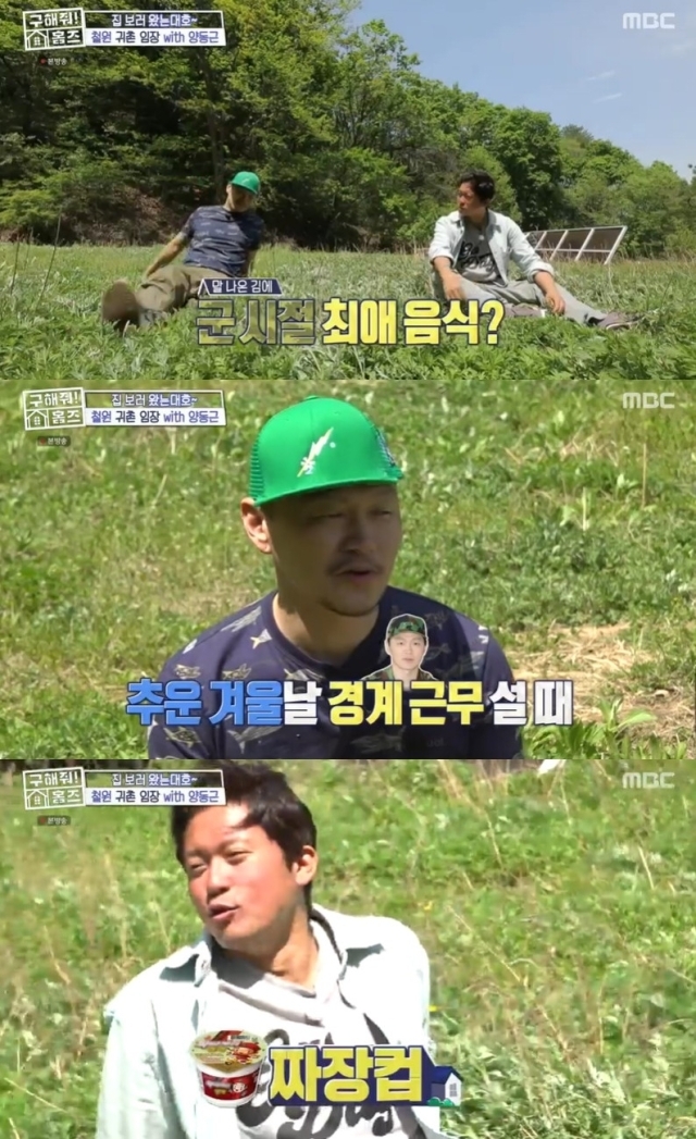 이날 소개할 집을 방문해서도 두 사람의 '군대 추억'은 계속됐다. 양동근은 "군대에 있을 때 정말 맛있게 먹은 것이 있냐"는 질문에 "겨울에 엄청 춥지만 경계 근무를 서야 한다. 너무 추위에 떨다가 들어오면 짜장컵이 맛있다. 그런데 그냥 짜장컵을 먹는 것이 아니라 참치캔을 짜장컵에 통으로 부었다. 그게 너무 맛있어서 그거 먹는 시간만 기다렸다"고 털어놨다.