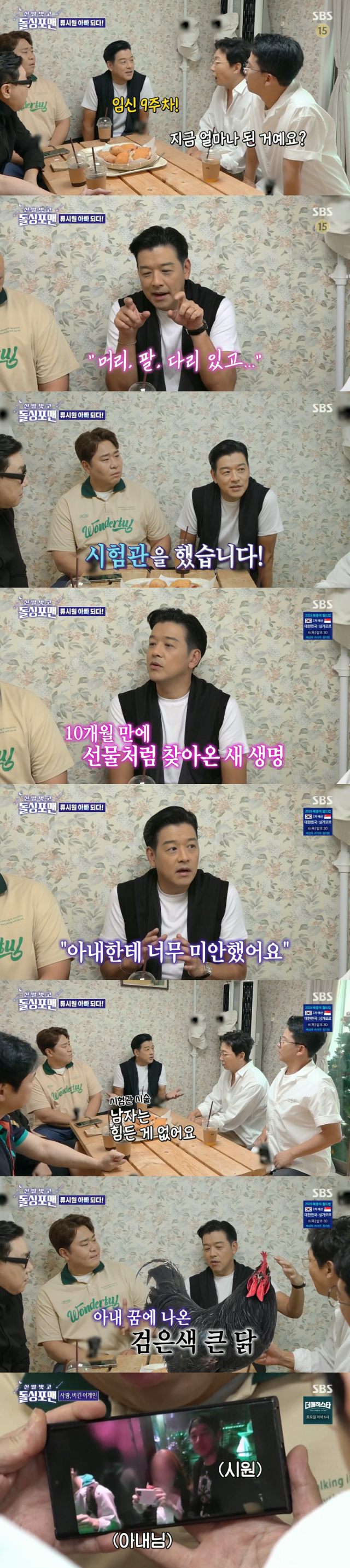 류시원은 또 "아내 꿈속에 닭장이 나왔는데 큰 검은 닭 세 마리가 있더래! 근데 갑자기 제가 닭장 문을 열고 닭들을 풀어줬는데 그 중 한 마리가 아내한테 안기더래! 그리고 뽀뽀하듯이 비비더래. 그래서 그걸 찾아봤더니 어여쁘고 현명한 딸이 생길 꿈이라더라. 올해 크리스마스가 예정일이다"라고 태몽 또한 최초 공개했다.