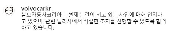 볼보차코리아 이날 별도의 입장문에서 "현재 논란이 된 사안에 대해 인지하고 있으며 관련 딜러사에서 적절한 조치가 진행될 수 있도록 협력하고 있다"고 전했다.