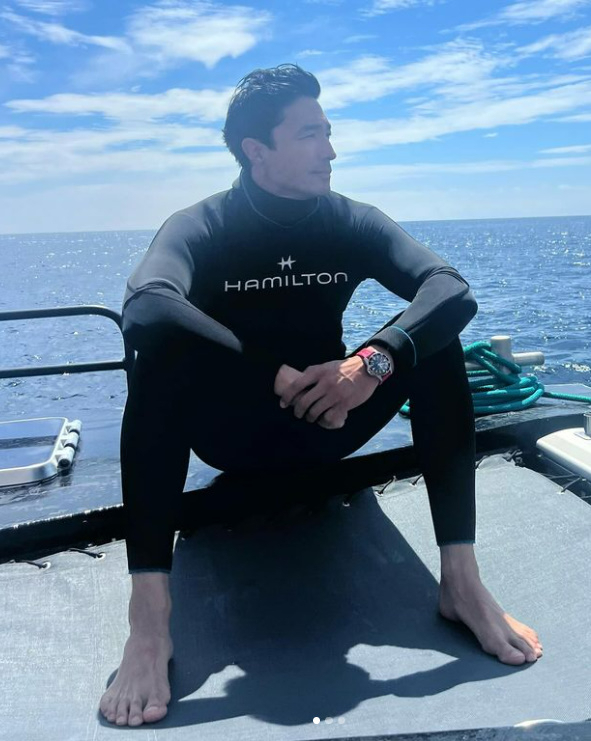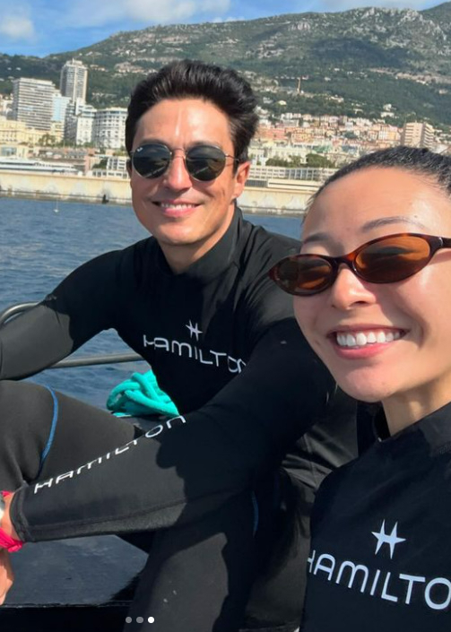 사진 속 다니엘 헤니는 아내 루 쿠마가이와 함께 보트에서 잠수복을 입은 채 환한 미소를 지었다.