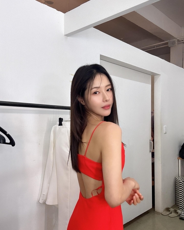 박하나는 레드 오렌지 컬러의 드레스를 입고 살짝 뒤를 돌아보며 카메라를 응시하고 있다. 끈 소매에 등허리 부분이 노출된 드레스에 박하나의 가녀린 몸매 라인이 드러난 모습이다. 박하나의 청순한 비주얼에 섹시한 매력이 돋보인다.