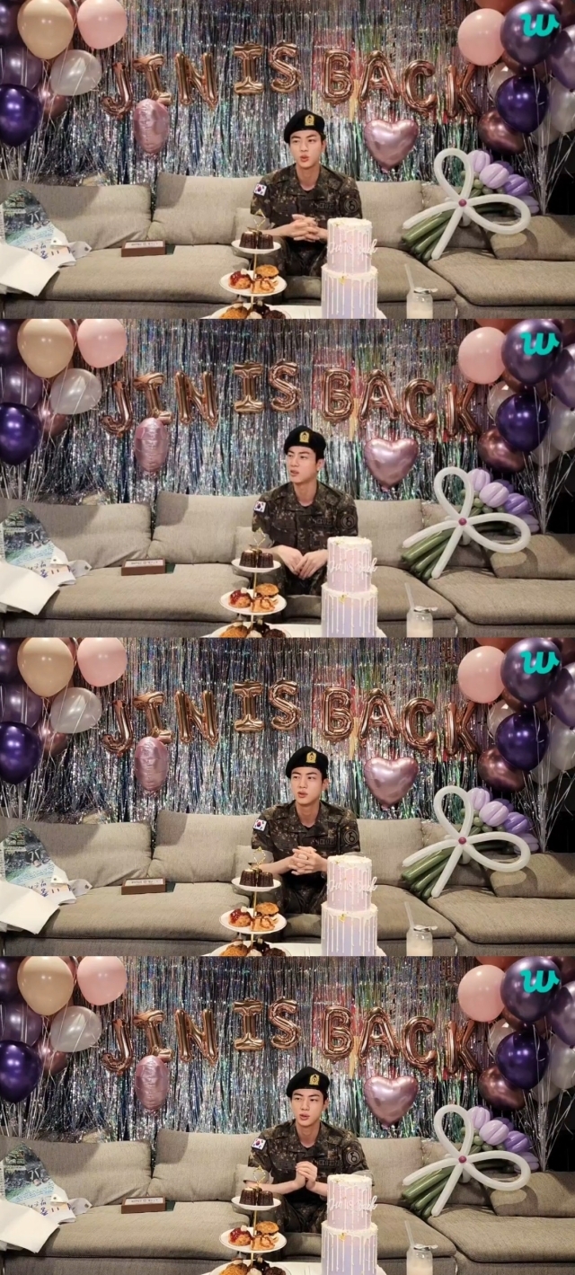 진은 12일 오전 팬 커뮤니티 위버스를 통해 라이브 방송을 진행, 팬들과 소통에 나섰다. 이는 진이 전역 후 진행한 첫 위버스 라이브 방송이기도 하다.