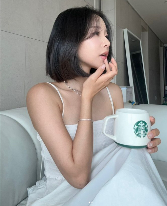 사진 속 이솔이는 한 손에 머그잔을 들고 포즈를 취한 모습이다. 단발과 원피스가 어우러져 청순미를 더했다.