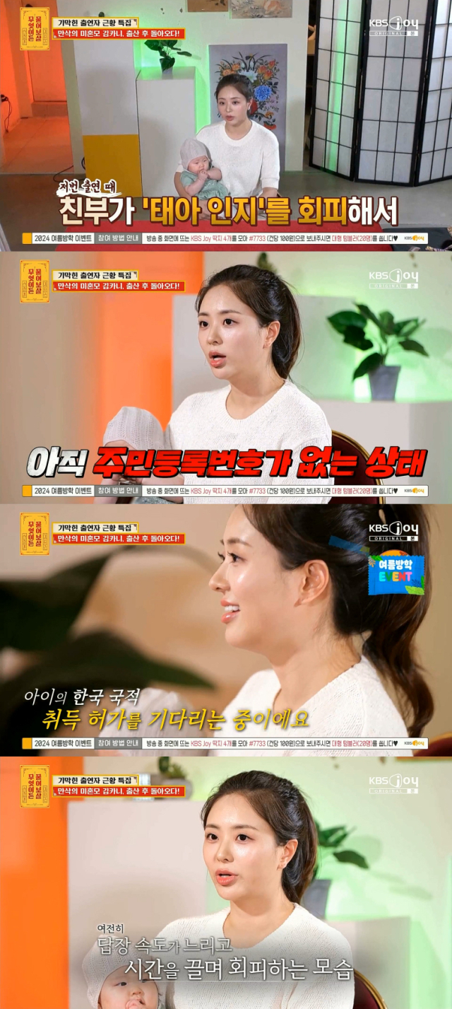 이에 이수근은 "아이 출생신고는 정리됐어?"라고 물었고, 김카니는 "현재 출생신고 절차를 밟는 중이다. 아직 주민등록번호가 없는 상태고 국적 취득 신고를 한 상태다. 그래서 아이의 한국 국적 취득 허가를 기다리는 중이다"라면서 "빠르면 다음 달 중으로 주민등록번호가 나올 예정이다"라고 답했다.