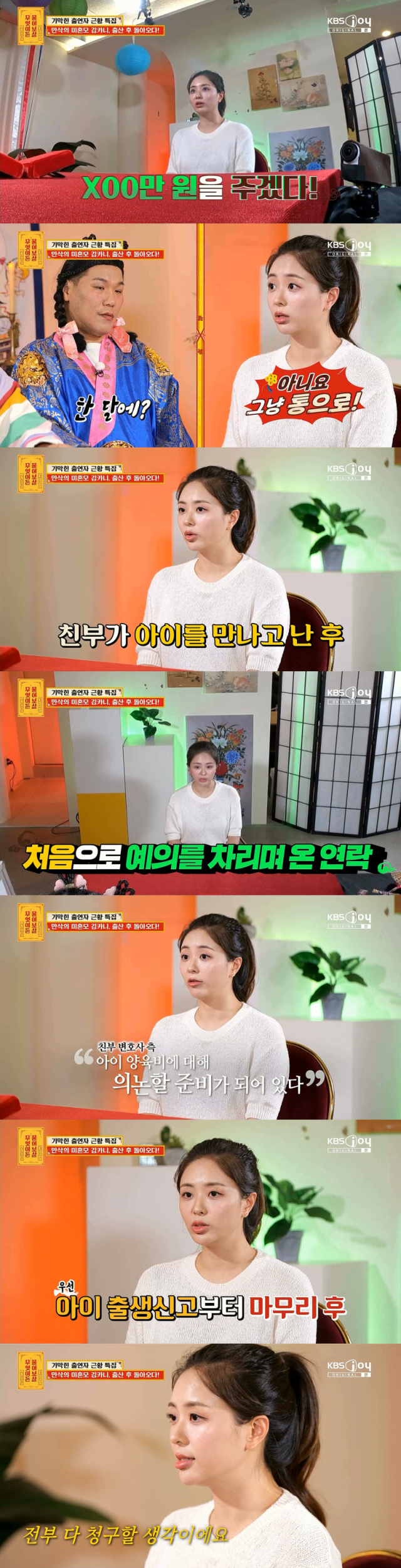 이어 서장훈은 "전에 우리가 무조건 변호사를 통해 양육비를 받고 친부의 존재를 지워버리라고 했는데 그 뒤로 어떻게 했어?"라고 물었고, 김카니는 "들은 대로 아이만 생각하면서 잘 지냈다. 그런데 아이가 태어난 다음에 아이의 국적 취득 절차 때문에 어쩔 수 없이 친부에게 연락을 했다. 여전히 답장 속도가 느리고 시간을 끌며 회피하는 모습이었다"라고 당시를 떠올렸다.