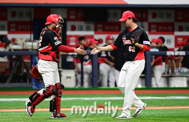 [54일 만에 세이브를 기록한 KIA 정해영이 김태군 포수와 기뻐하고 있다 / 고척 = 유진형 기자 zolong@mydaily.co.kr]