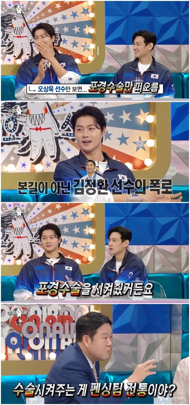 이날 오상욱은 과거 펜싱 선배 김정환이 자신의 포경수술에 대해 폭로한 사실을 털어놨다. 오상욱은 “올림픽 금메달 따고 멋있다는 반응보다 내 얼굴만 보면 포경수술이 생각난다 이야기가 더 많았다”라고 털어놓았다.