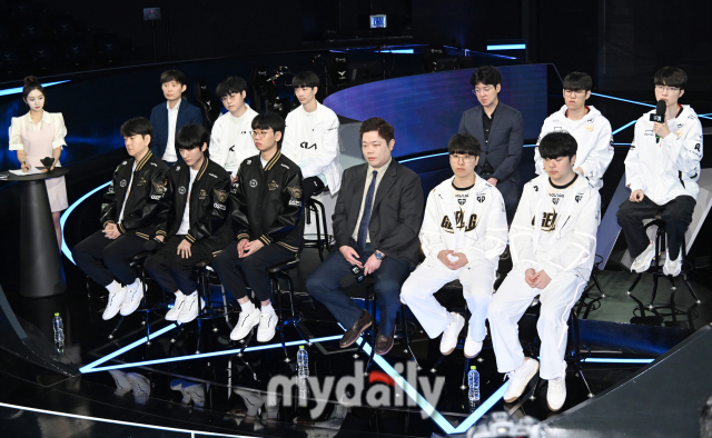 [마이데일리 = 송일섭 기자] 26일 오후 서울 종로 LCK 아레나에서 진행된 '2024 리그오브레전드(LoL) 월드 챔피언십' LCK 대표팀 미디어데이에서 참석자들이 이야기를 하고 있다.