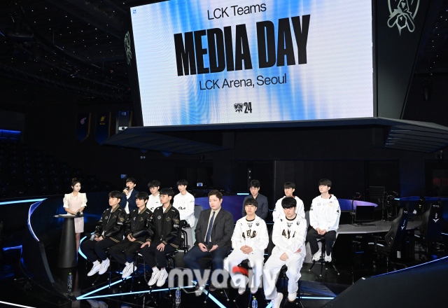 [마이데일리 = 송일섭 기자] 26일 오후 서울 종로 LCK 아레나에서 진행된 '2024 리그오브레전드(LoL) 월드 챔피언십' LCK 대표팀 미디어데이에서 참석자들이 이야기를 하고 있다.