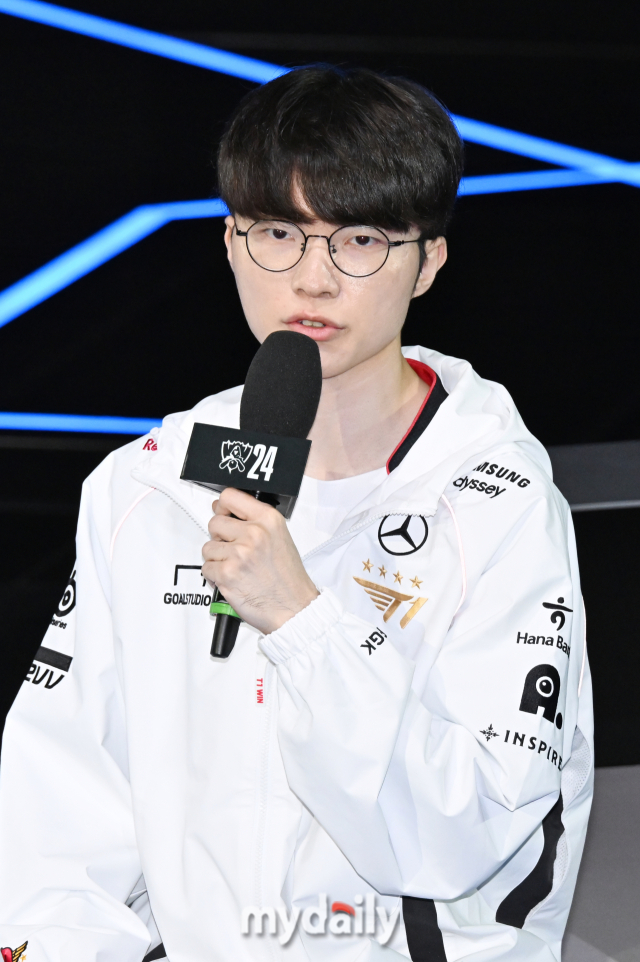 [마이데일리 = 송일섭 기자] '페이커' 이상혁이 26일 오후 서울 종로 LCK 아레나에서 진행된 '2024 리그오브레전드(LoL) 월드 챔피언십' LCK 대표팀 미디어데이에서 이야기를 하고 있다.