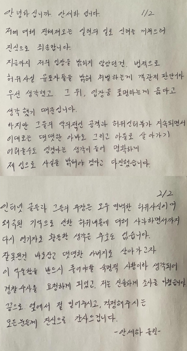 마지막으로 “이제는 떳떳한 아빠로, 아들로 살아가기 어려울 수도 있겠다는 생각에 직접 입장을 밝히게 됐다"며 "허위사실에 대한 사과 없이 다시 연기자로 활동할 생각은 없다"고 못 박았다.