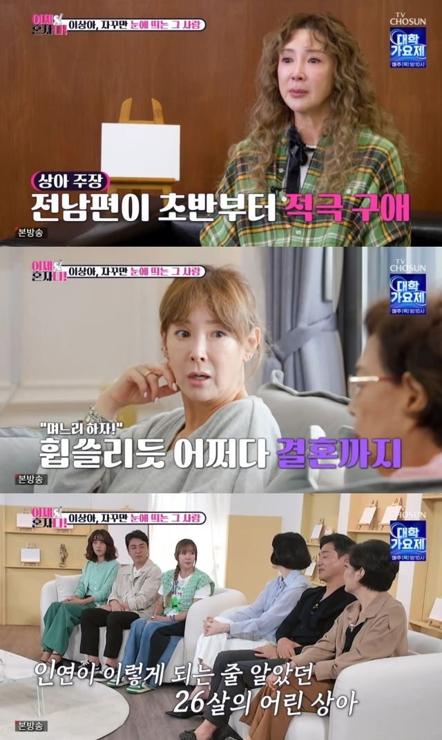 그러면서 "약속한 날에 (어머니께서) 나를 위해 음식을 차리다 다쳐서 입원을 했다더라. 죄송한 마음에 병원을 찾아갔다. 그런데 거기서 전남편의 아버지도 만났다. 그러더니 '며느리 하자'고 하시더라. 그렇게 순식간에 결혼을 하게 됐다"고 털어놨다.