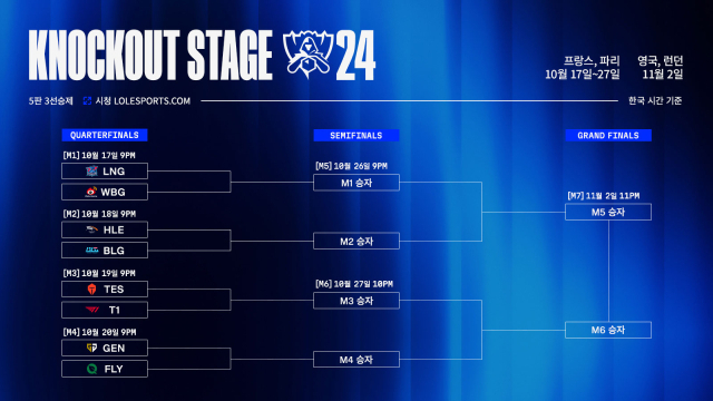 8강~결승전은 5전 3선승제 토너먼트 형식으로 경기가 진행된다. 8강 대진 추첨 결과 LCK팀 내전이 없어 한국팀 모두가 나란히 4강 진출도 가능하다.