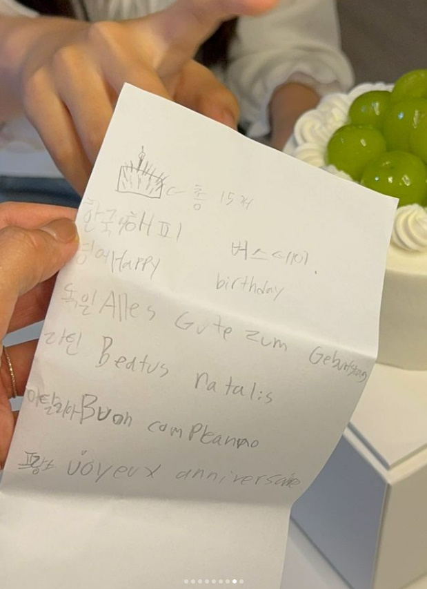 사진은 정성껏 끓인 미역국과 생일파티 모습이 담겼다. 박지윤은 2010년 10월 22일 태어난 첫딸의 생일을 아들과 함께 축하한 것으로 보인다. 동생은 누나를 위해 세계 각국 언어로 '생일 축하해'를 적어 눈길을 끌었다.