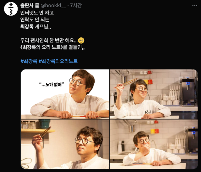 '최강록의 요리 노트'를 출판한 출판사 클은 지난 22일 SNS에 "인터넷도 안 하고 연락도 안 되는 최강록 셰프님 우리 팬 사인회 한 번만 해요”라며 “최강록의 요리노트를 곁들인"이라는 글을 게재했다.