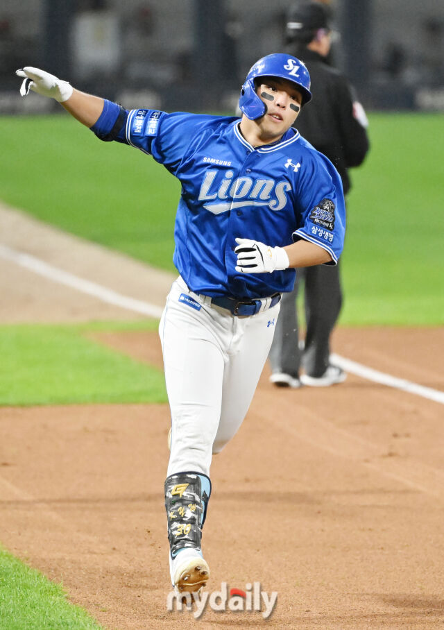 [마이데일리 = 광주 송일섭 기자] 28일 오후 광주광역시 임동 광주기아챔피언스필드에서 진행된 '2024 프로야구 KBO리그 포스트시즌' 한국시리즈 5차전 KIA타이거즈와 삼성라이온즈의 경기. 삼성 김영웅이 1회초 2사에서 솔로홈런을 터뜨린 뒤 환호하고 있다.