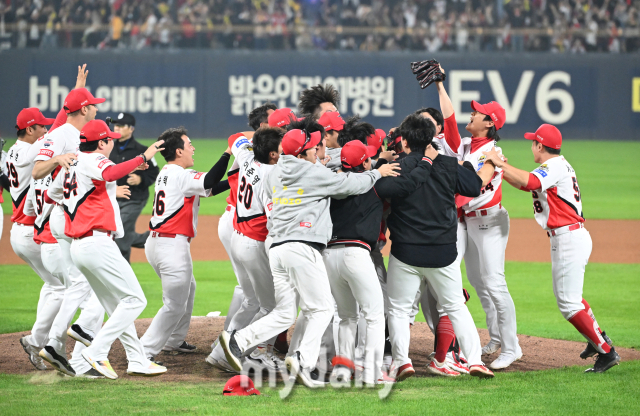 [마이데일리 = 광주 송일섭 기자] 28일 오후 광주광역시 임동 광주기아챔피언스필드에서 진행된 '2024 프로야구 KBO리그 포스트시즌' 한국시리즈 5차전 KIA타이거즈와 삼성라이온즈의 경기. 기아 선수들이 7-5로 승리해 우승한 뒤 환호하고 있다.
