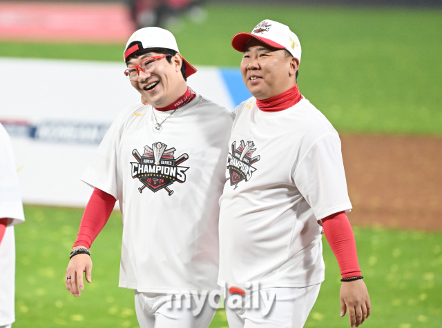 [마이데일리 = 광주 송일섭 기자] 28일 오후 광주광역시 임동 광주기아챔피언스필드에서 진행된 '2024 프로야구 KBO리그 포스트시즌' 한국시리즈 5차전 KIA타이거즈와 삼성라이온즈의 경기. 기아타이거즈가 7-5로 승리하고 시리즈 전적 4-1로 우승을 차지했다. 기아 이범호 감독과 양현종이 미소를 짓고 있다.