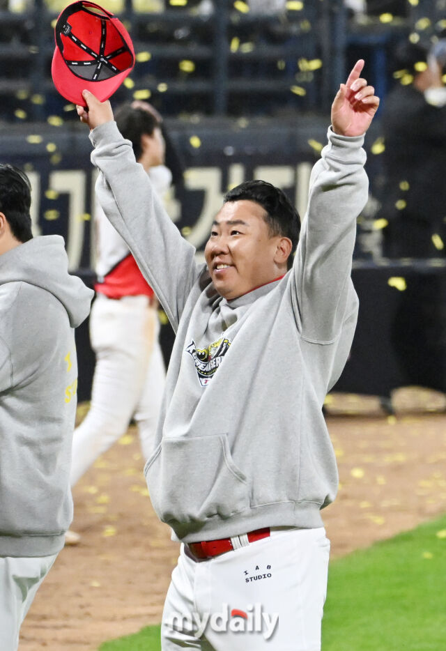 [마이데일리 = 광주 송일섭 기자] 28일 오후 광주광역시 임동 광주기아챔피언스필드에서 진행된 '2024 프로야구 KBO리그 포스트시즌' 한국시리즈 5차전 KIA타이거즈와 삼성라이온즈의 경기. 기아타이거즈가 7-5로 승리하고 시리즈 전적 4-1로 우승을 차지했다. 이범호 감독이 관중들에 인사를 하고 있다.
