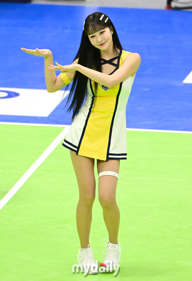 [마이데일리 = 수원 유진형 기자] 현대건설 정가예 치어리더가 31일 경기도 수원체육관에서 열린 '2024-2025 도드람 V리그' 현대건설과 한국도로공사의 경기에서 응원하고 있다.