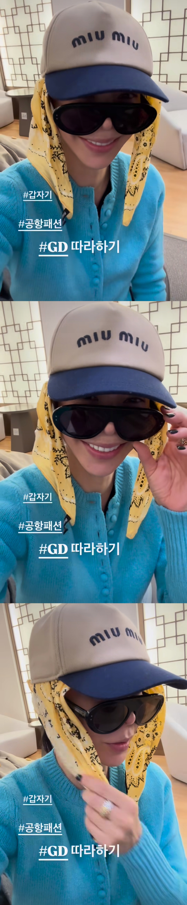 이혜영은 6일 자신의 개인 소셜미디어 계정을 통해 "#갑자기 #공항패션 #GD 따라 하기"라는 글과 함께 최근 화제를 모은 지드래곤의 할머니 스카프 공항패션을 오마주 한 동영상을 업로드 했다.