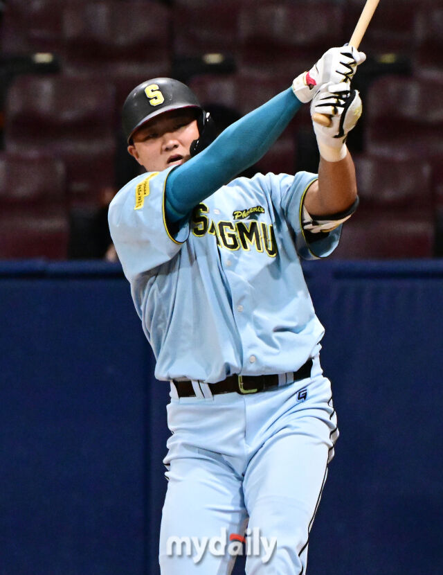 [마이데일리 = 곽경훈 기자] 상무 이재원이 6일 오후 서울 고척스카이돔에서 진행된 대한민국 야구대표팀과의 연습 경기에서 타격을 하고 있다.
