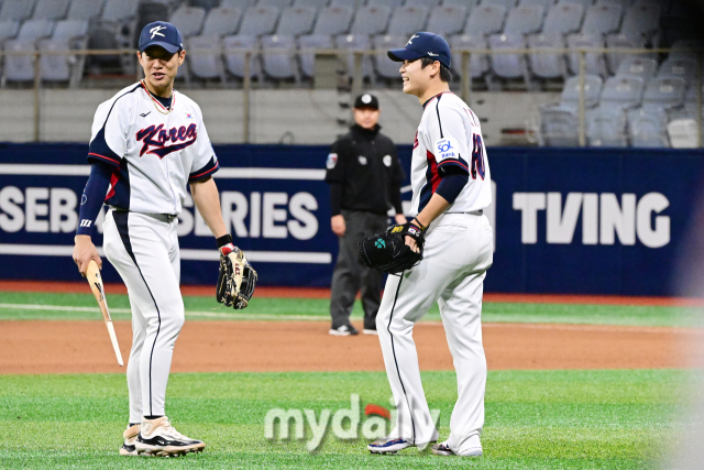 [마이데일리 = 곽경훈 기자] 대한민국 야구대표팀 박영현이 6일 오후 서울 고척스카이돔에서 진행된 상무와의 연습 경기 9회초 김재상의 부러진 배트를 피한 뒤 미소를 짓고 있다.