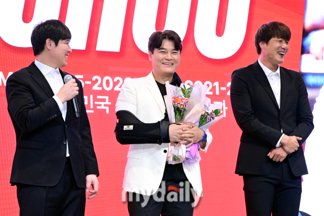 [마이데일리 = 인천 곽경훈 기자] SSG 최정이 7일 오후 인천 송도 경원재 앰배서더 인천에서 진행된 추신수 은퇴 기자회견에서 꽃다발을 전달한 뒤 인사말을 하고 있다.